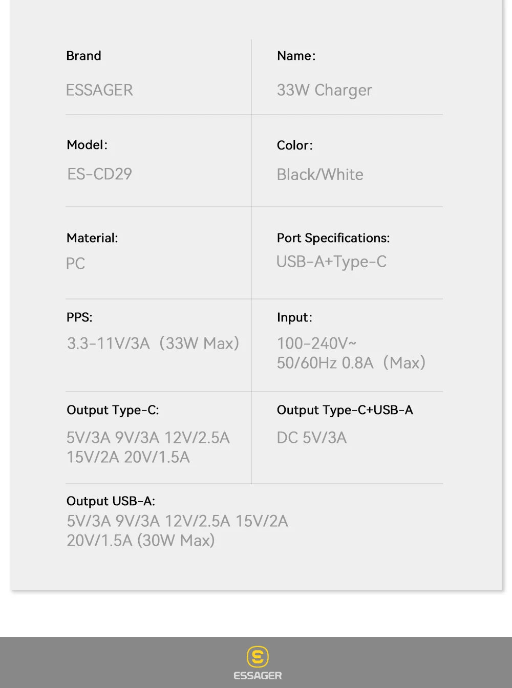 Type C Output:5V/3A,9V/3A,10V/2.25A,12V/2.5A,15V/2A,20V/1.5A(30W MAX)